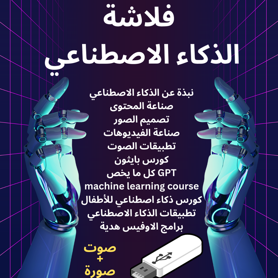" فلاشة تعليم أساسيات الذكاء الاصطناعي الشاملة. تحتوي على كورسات عن صناعة المحتوى، تصميم الصور والفيديوهات، تطبيقات الصوت، بايثون، GPT، Machine Learning"