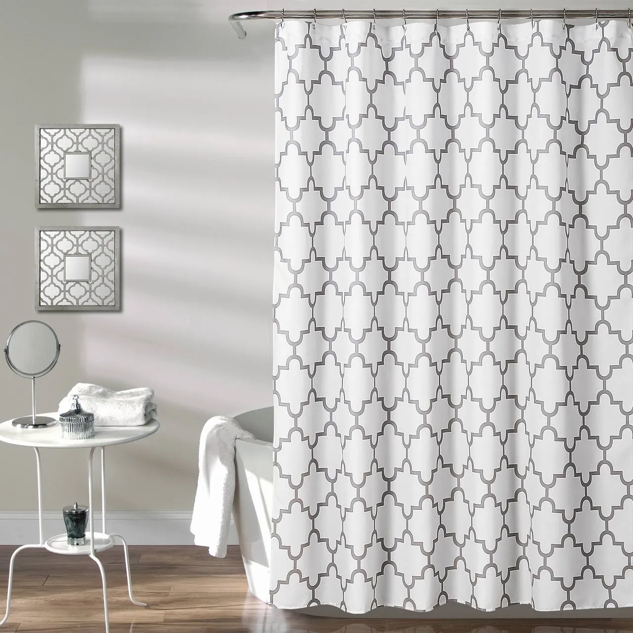ستارة بانيو مشمع مقاومة للمياه، متوفرة بلونين (أبيض × فضي وأبيض × جولد)، مقاس 180×180 سم، سهلة التنظيف والتركيب، مثالية لحماية أرضية الحمّام لمسة ديكور أنيقة.