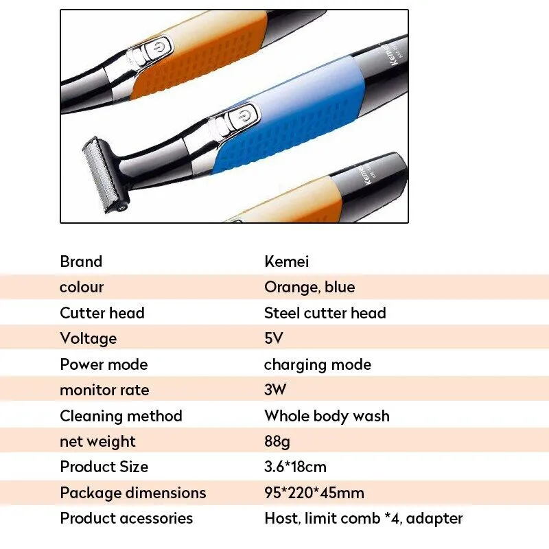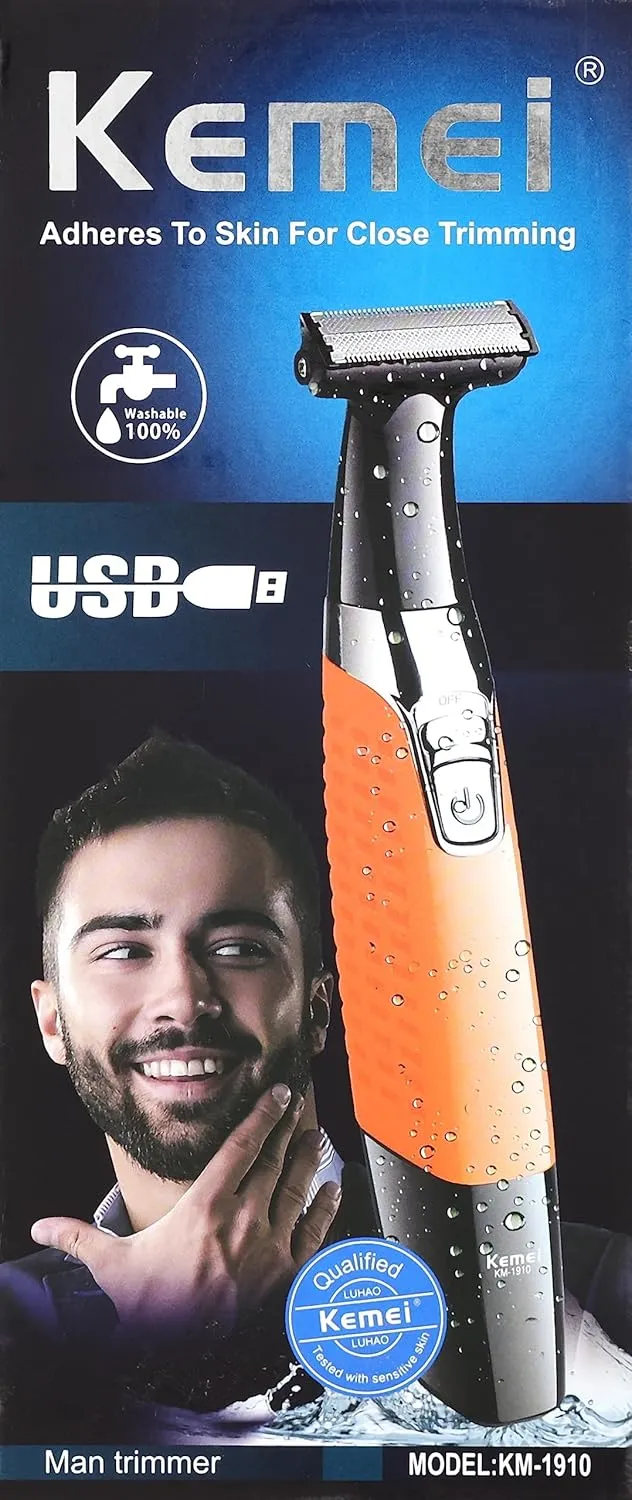 احصل على ماكينة حلاقة كيمي KM-1910 الأصلية بتصميم أنيق ومضاد للماء. تعمل بالشحن، بفولتية عالمية، وتأتي مع شاحن USB. مثالية لحلاقة الوجه والجسم بدقة ونعومة.