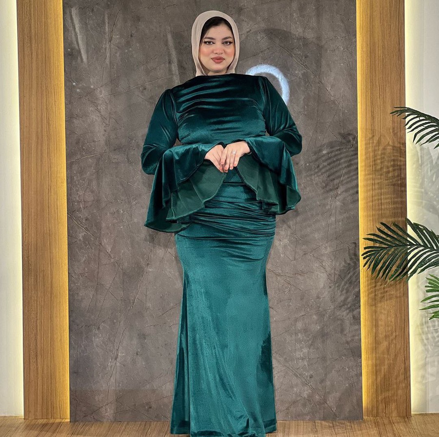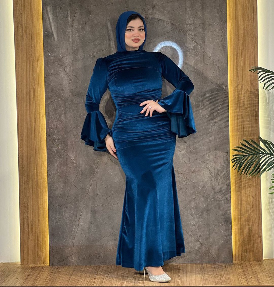 نقدم لكِ فستان السهرة الذي يجمع بين الفخامة والراحة مصنوع من خامة القطيفة الفرنسي التي تمنحكِ ملمسًا ناعمًا ومظهرًا ملكيًا. ❤️