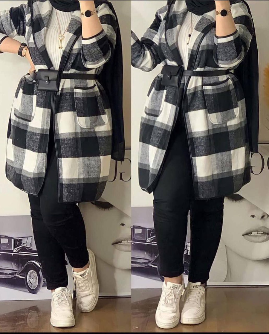 لونج شميز كاروه جوخ شتوي 2 جيب بكابيتشو وحزام. مقاس وان سايز (60-85 كجم) ومتوفر بأبيض وأسود كاروهات. متوفر بخصم حصري لموسم الشتاء عند تيموز فاشون.
