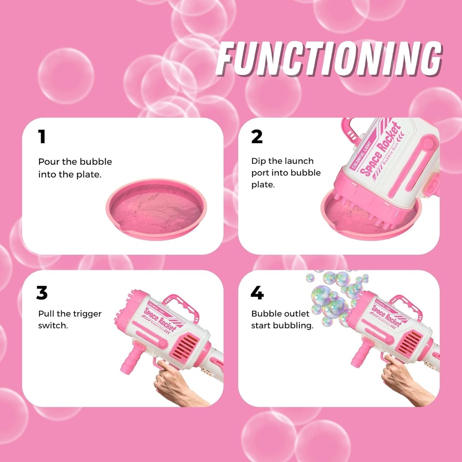 - وضع الفقاعات: بس حط البطارية، صب سائل الفقاعات بالطبق، واضغط الزناد.. وشوف الفقاعات تطلع تلقائياً. 🤩