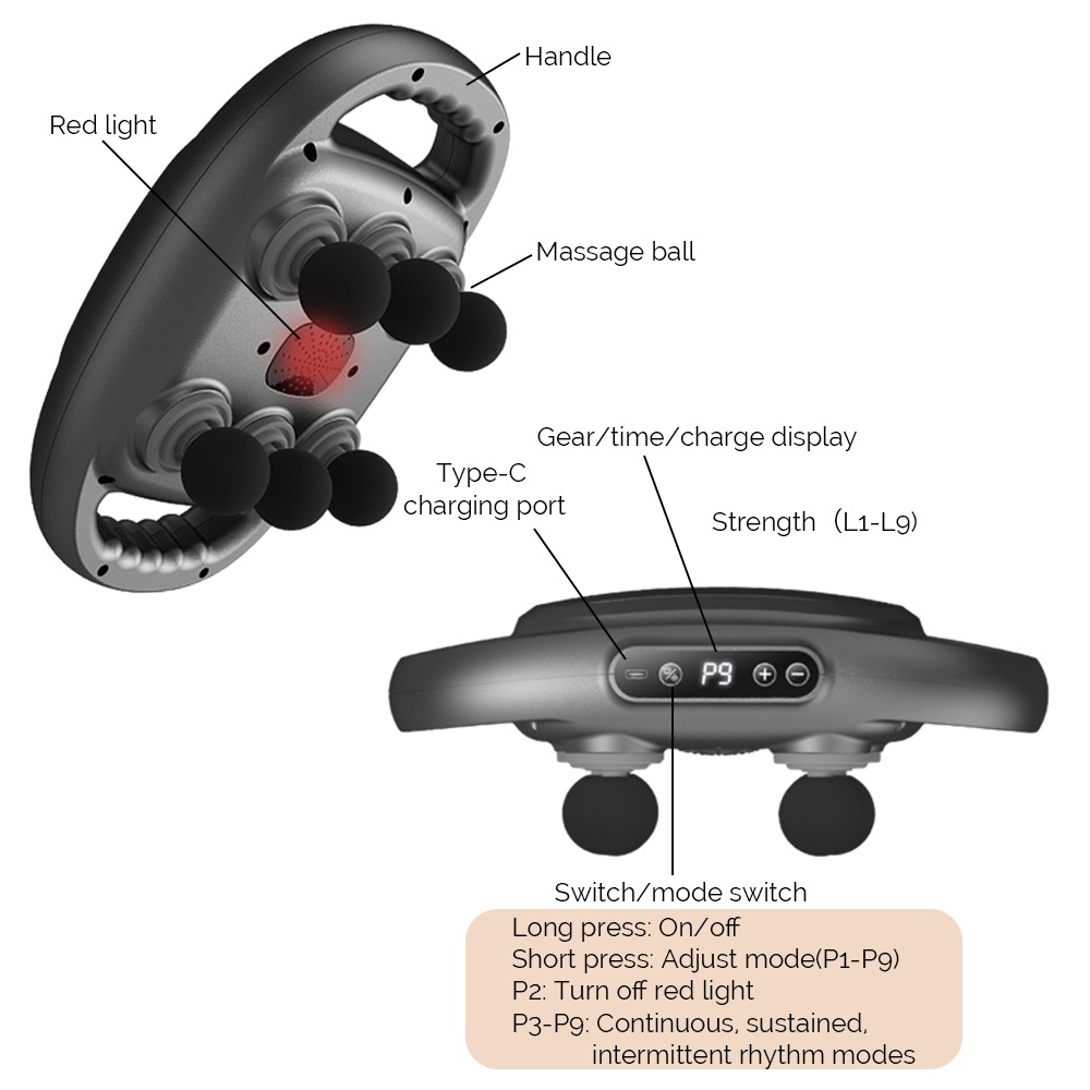 - تصميم سداسي شامل: مصمم بـ 6 رؤوس مرنة تتحرك بانسيابية، عشان يوصل لكل مناطق الجسم بسهولة (الظهر، الرقبة، الكتف، القدمين)، لتجربة تدليك شاملة.