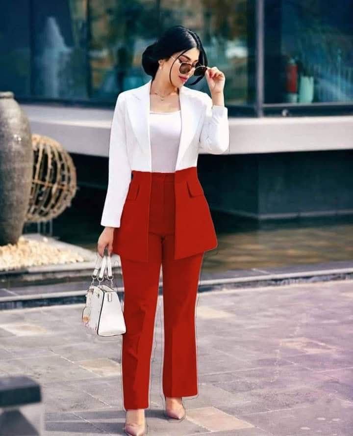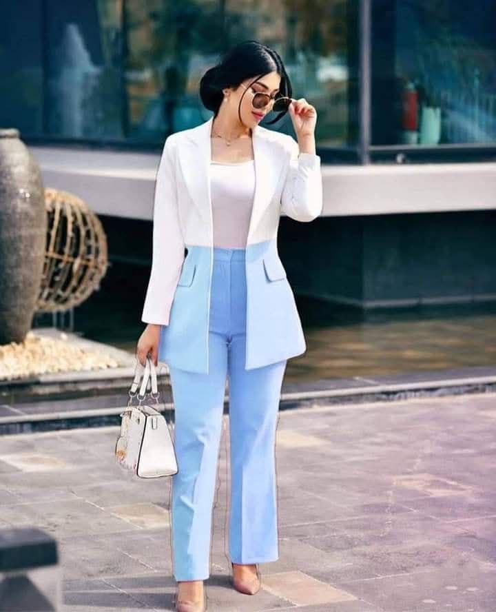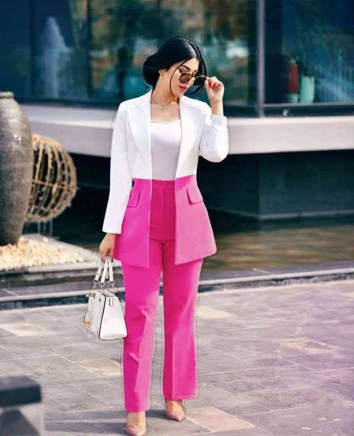 بدلة نسائية سيمي فورمال من خامة روزالين ليكرا الفريدة المبطن من الداخل بخامة ستان. متوفر بتصميمات ثنائية الألوان ومقاسات من 50 إلى 125 كيلو.