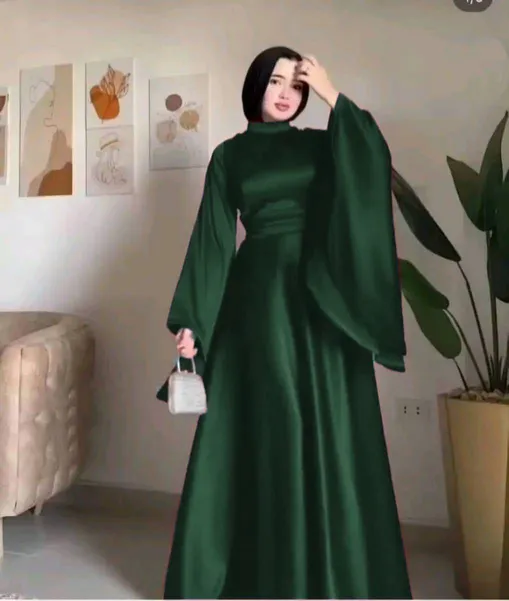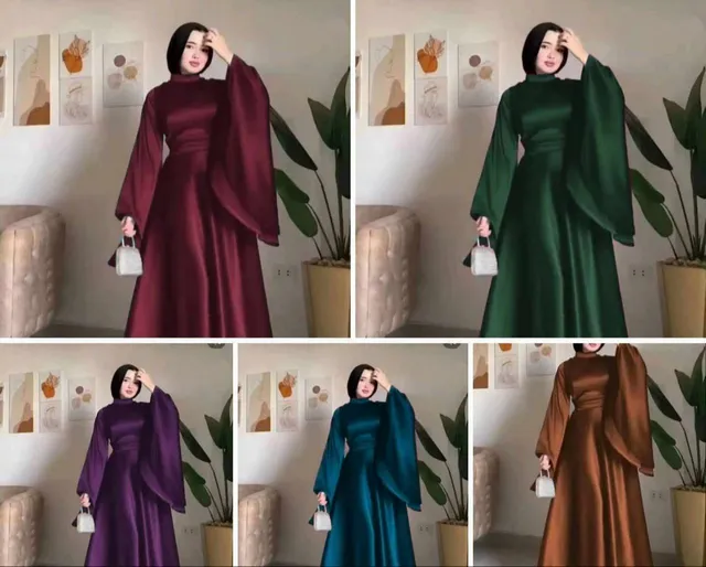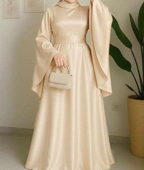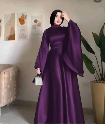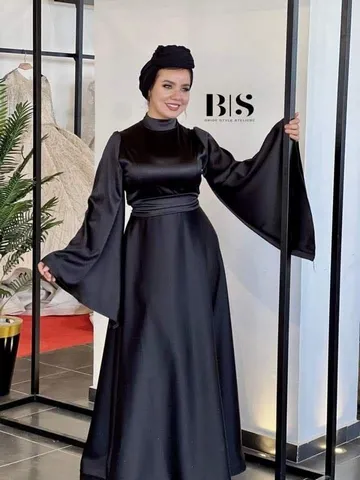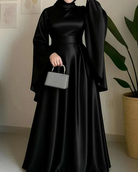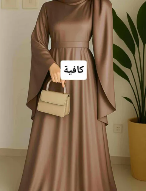 فستان سواريه أنيق كم كلوش من خامة ستان لامع. متاح بمجموعة ألوان راقية: أسود، زيتي، بني، بيج، كافيه، موف، نبيتي، وبترولي. يناسب جميع المقاسات من 50 إلى 100 كيلو.
