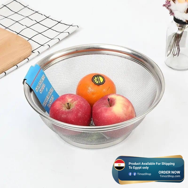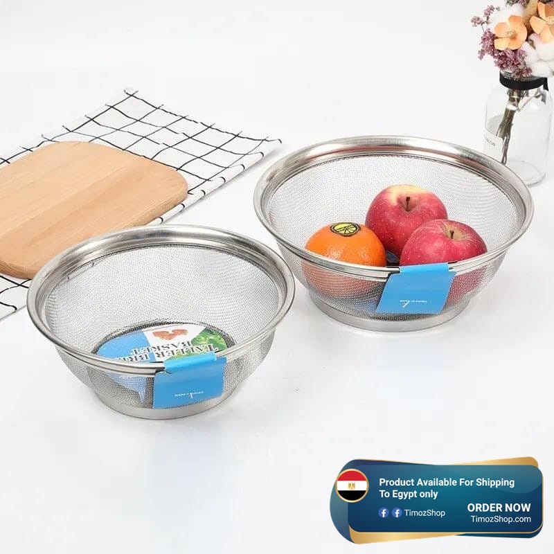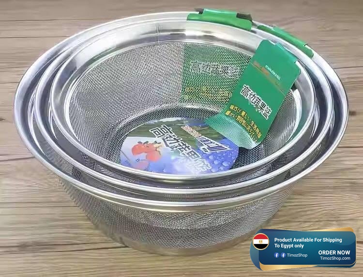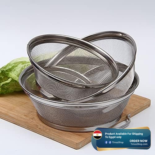 طقم مصافي استانليس 3 قطع بمقاسات كبيرة (22، 25، 28 سم)، لتصفية المكرونة والخضروات والفواكه، مزود بقاعدة، متوفر بخصم خاص لفترة محدودة.
