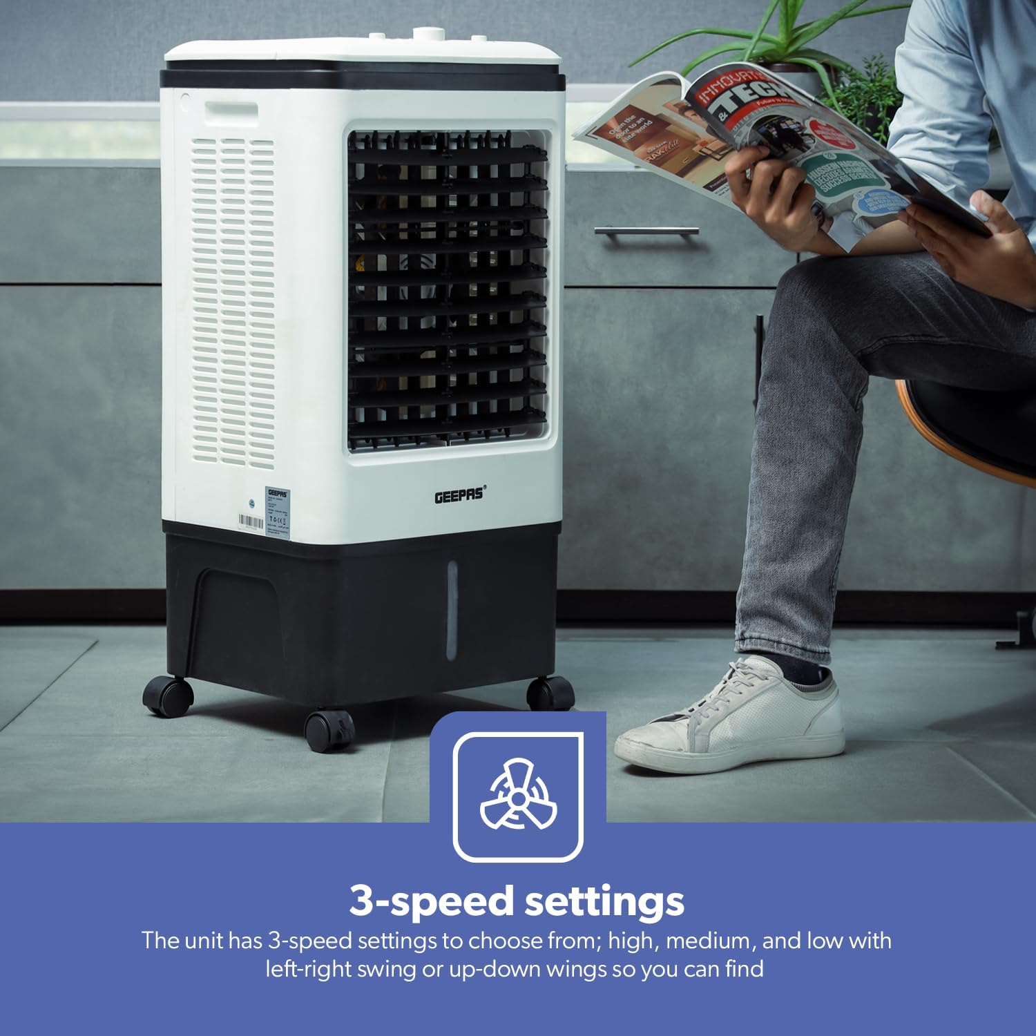 مبرد صحراوي متنقل (150 واط) بتصميم برج. 3 سرعات قابلة للتعديل، مع عبوات ثلج وفلتر لتنقية وترطيب الهواء. خفيف الوزن (1.04 كغم) وبعجلات. تحكم عن بعد وضمان سنتين.