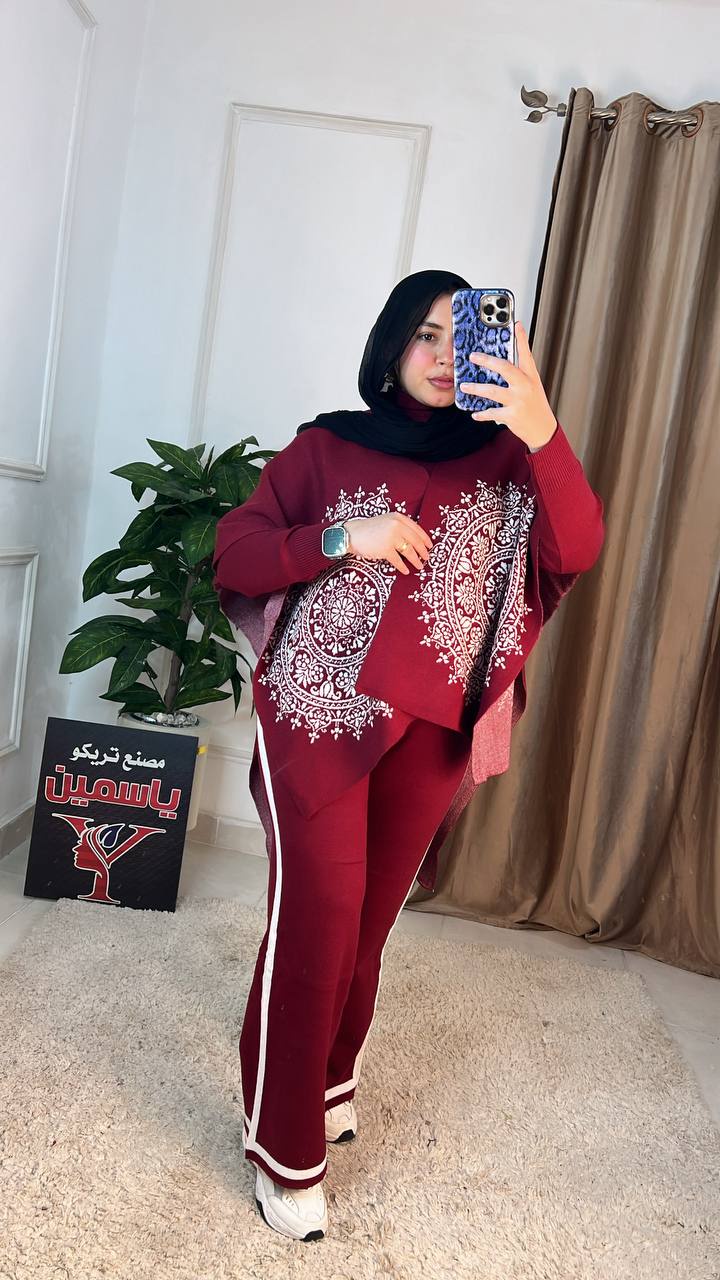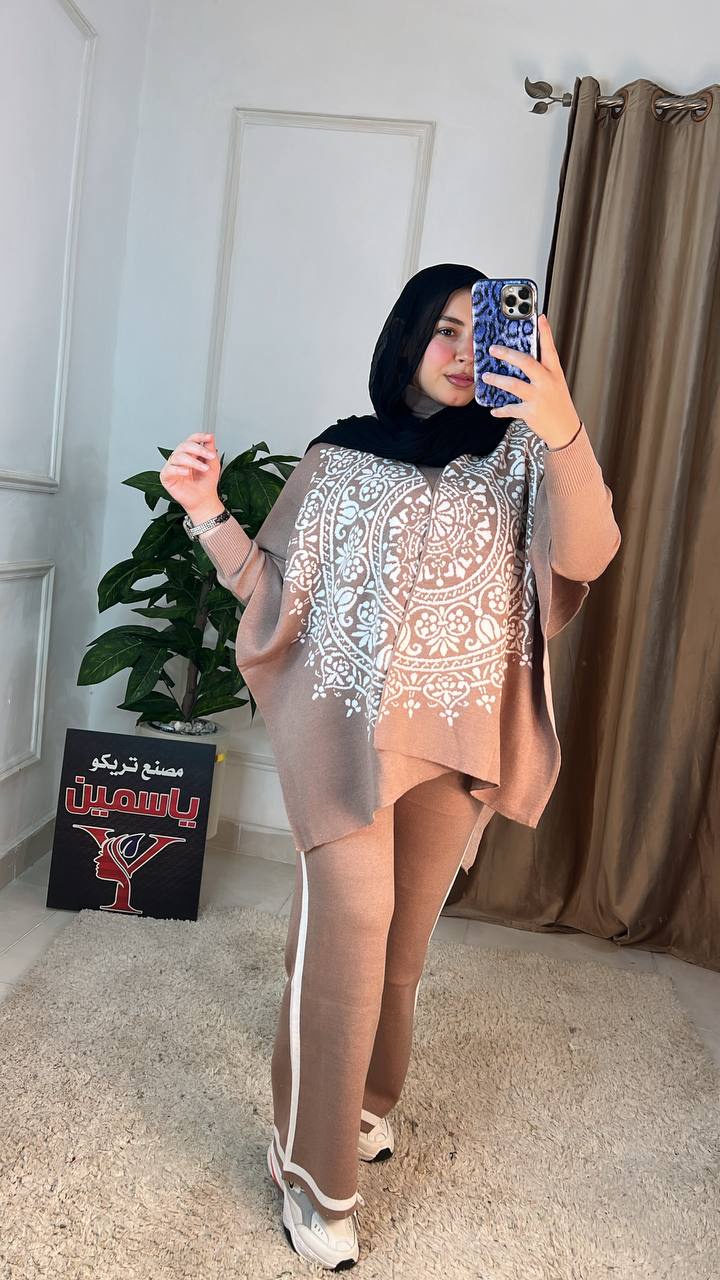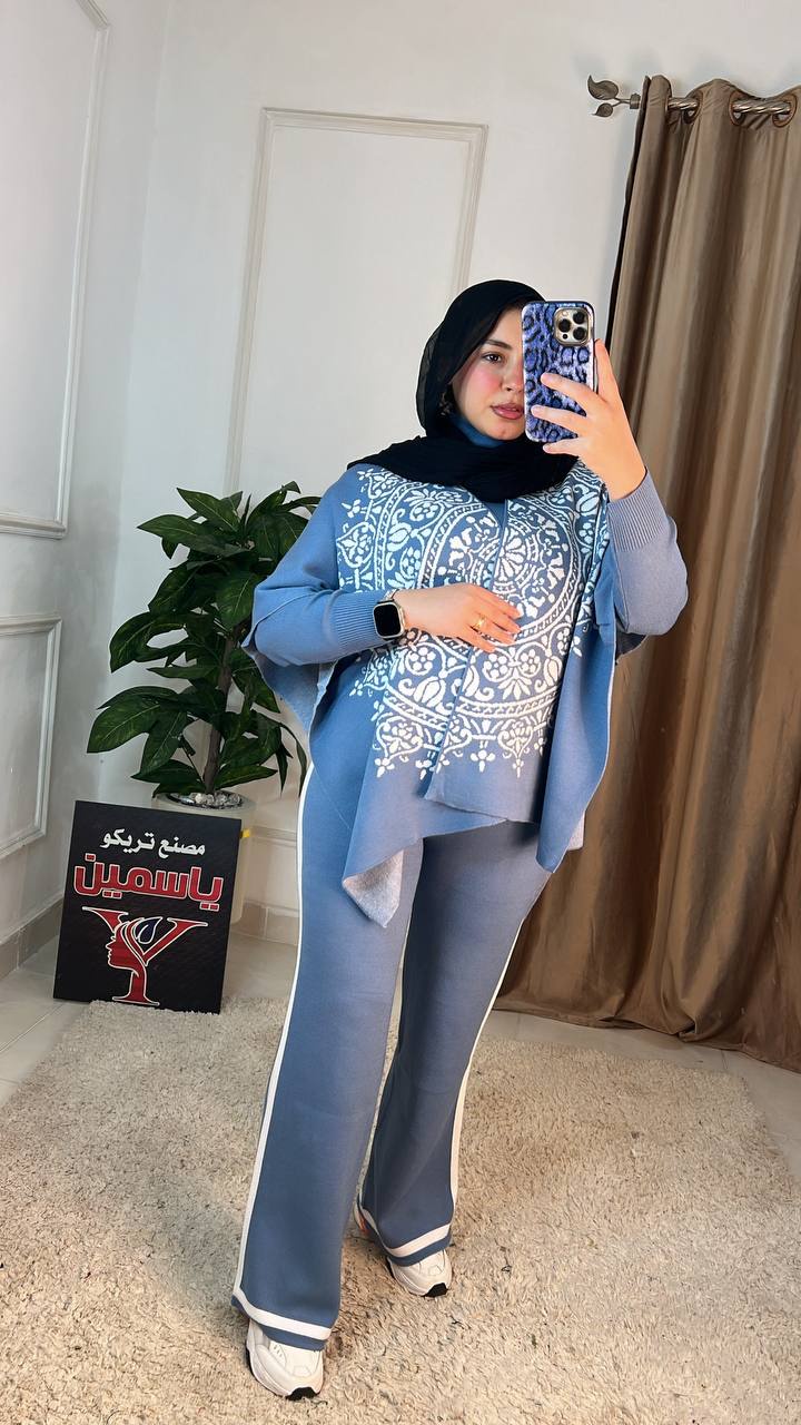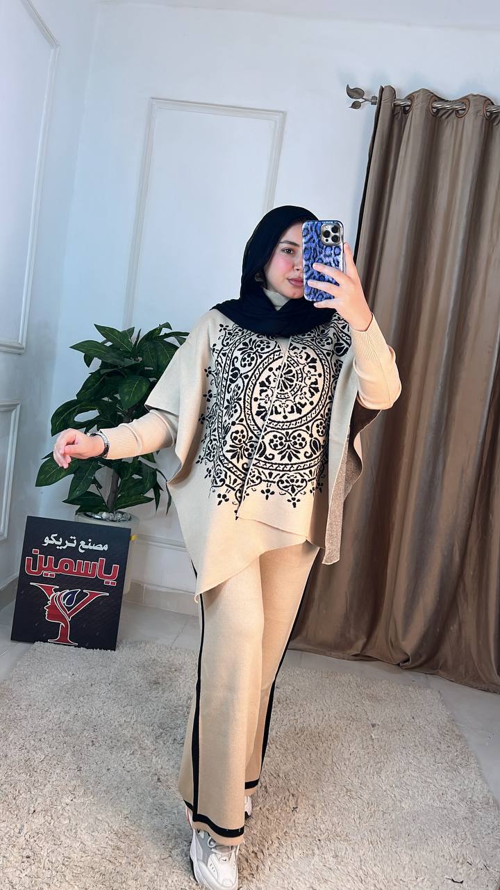 اكتشفي سوت شتوي عملي وأنيق مكون من 3 قطع (بنطلون، بلاوز، بونشو) مصنوع من خامة العجينة الإيطالية عالية الجودة. تصميم عصري "وان سايز" مثالي لإطلالة شتوية