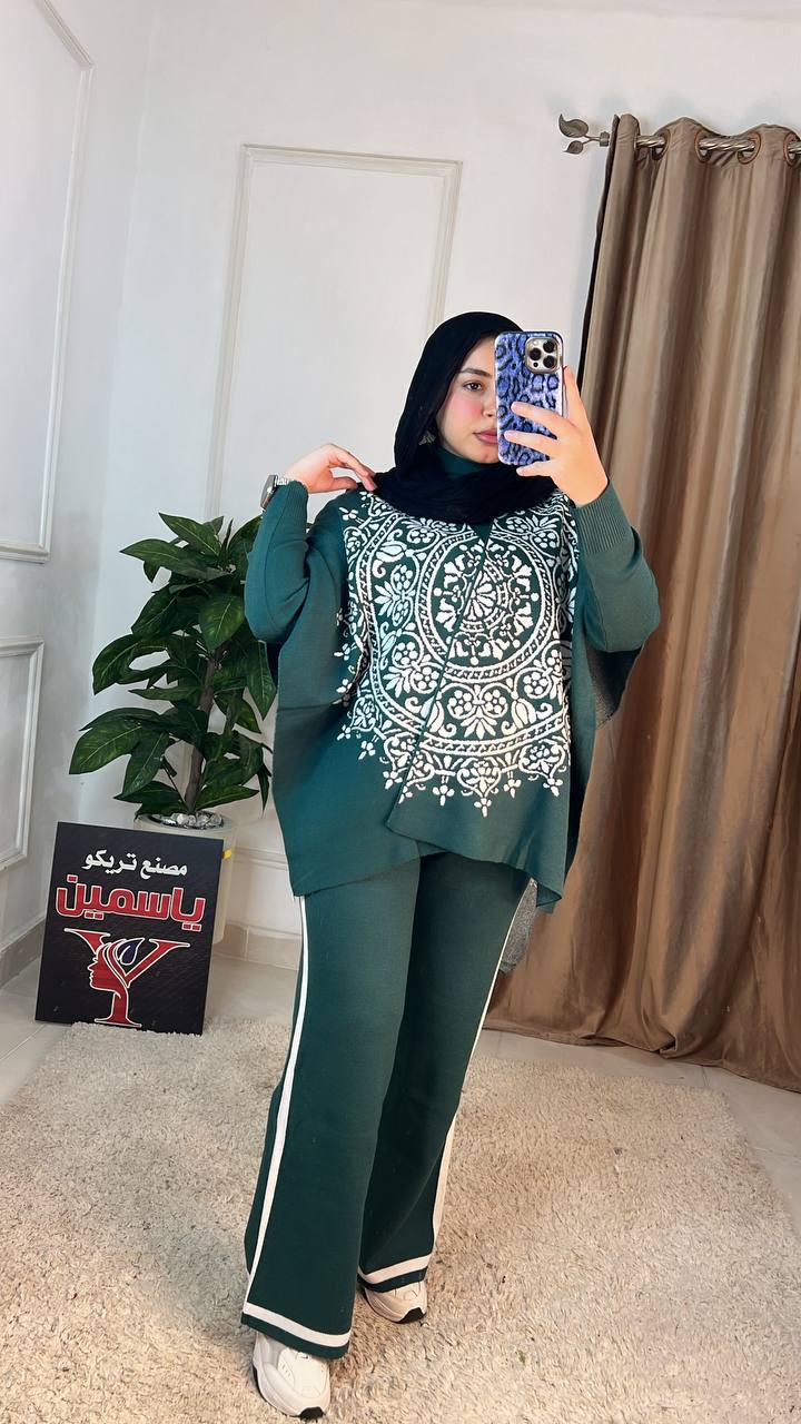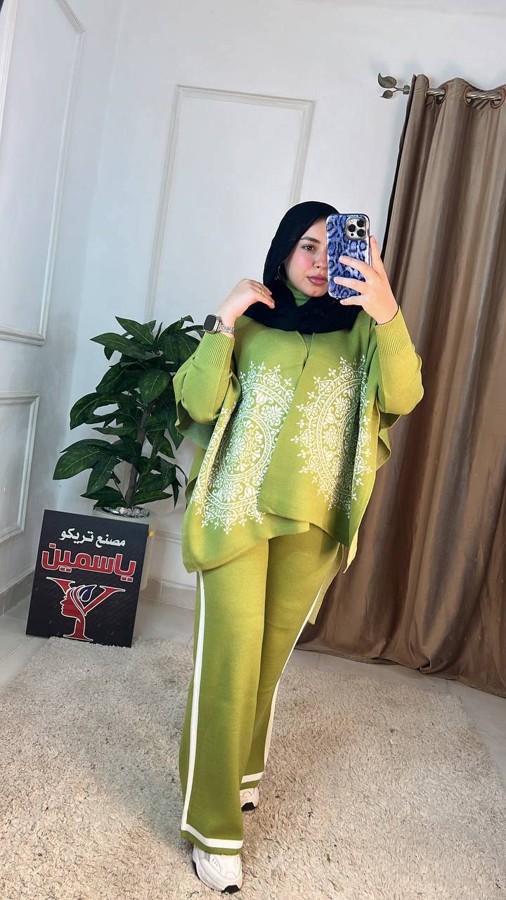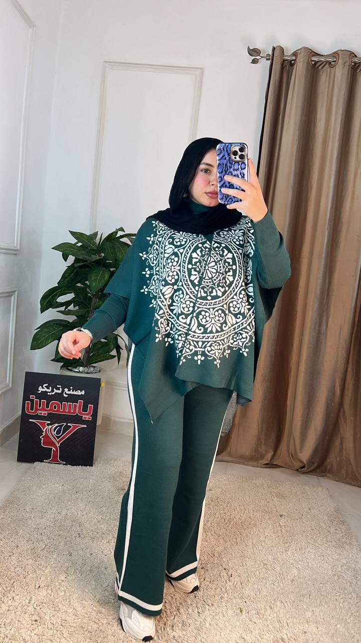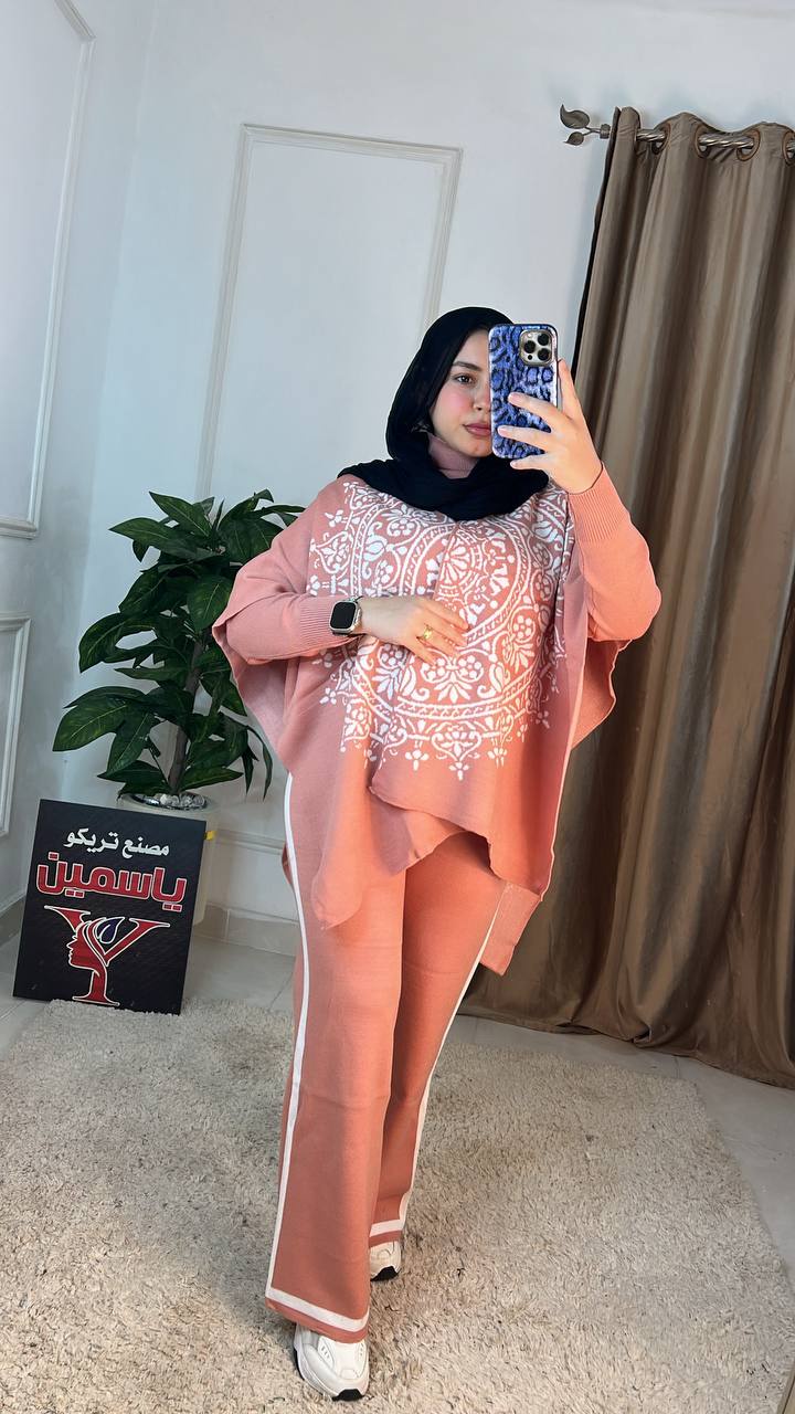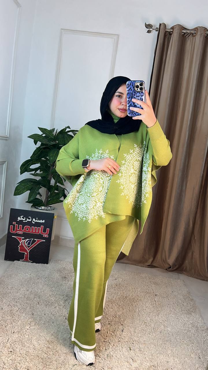 اكتشفي سوت شتوي عملي وأنيق مكون من 3 قطع (بنطلون، بلاوز، بونشو) مصنوع من خامة العجينة الإيطالية عالية الجودة. تصميم عصري "وان سايز" مثالي لإطلالة شتوية