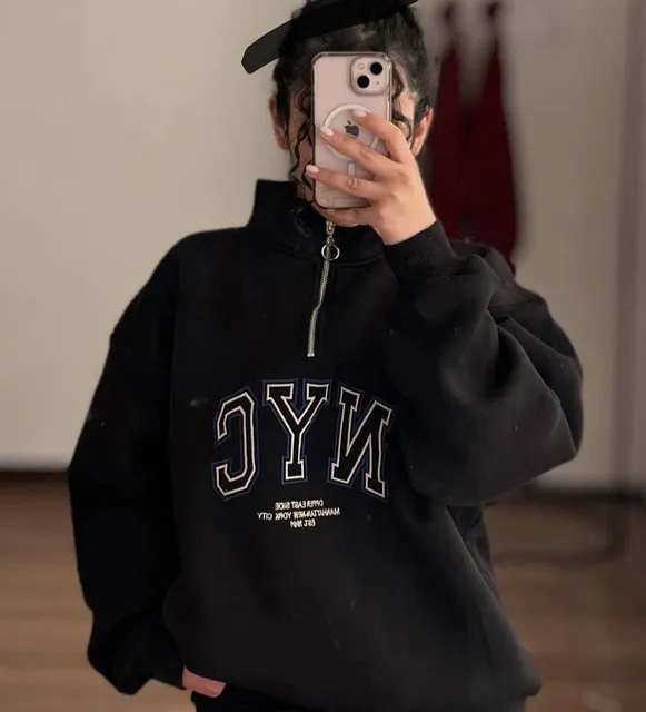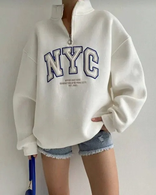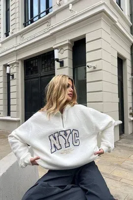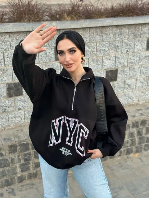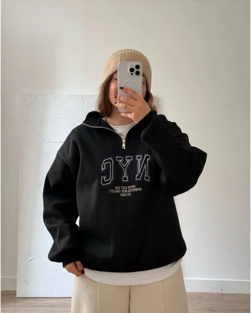 سويت شيرت حريمي نص سوستة مطبوع NYC بخامة ميلتون بلوش ناعمة وبطانة داخلية تقيلة، مناسب لفصل الشتاء، متوفر بمقاسات من ٥٠ لـ ٨٠ كيلو، وألوان أسود وأوف وايت.